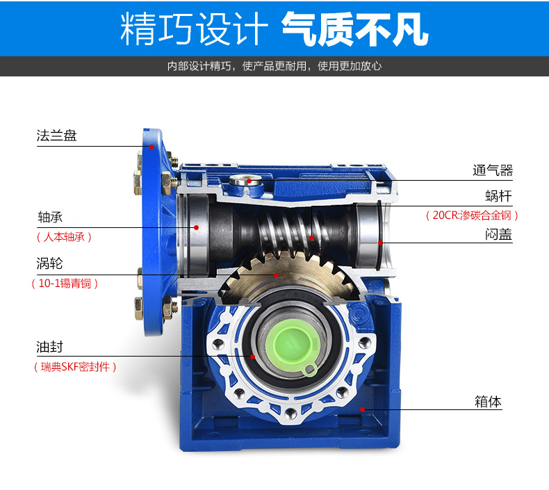 RV系列鋁合金微型蝸桿減速器是我司研制的新一代實用型產品,符合Q/JF01-1999標準,按最新國家標準設計,采用新工藝、新材料生產、吸收了國外技術并加以創新,使其整機性能優于國內同類型產品。適用于食品、皮革、紡織、醫療、玻璃、陶瓷、化工、輕工等機械設備的減速傳動,是現代化傳動系統實現單機傳動及生產流水線上實現機電一體化的最佳選擇。該系列產品顯著特點:方箱外形,優質鋁合金壓鑄箱體,美觀大方;散熱性能好,承載能力大;多面安裝,空心軸輸出軸結構,另配有各種輸入、輸出方式,并能方便地與其他傳動機械組合,適應性能強傳動平穩,噪音小,安全可靠,經濟耐用。